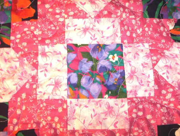 "The center area out to thru the large border area is the mystery quilt I did at quilt group New Years Eve this year. Well, I thought it a bit small for a lap quilt so I added the other borders in May then machine freemotion quilted it to give as a graduation gift to a young lady at out church who had been in my sunday school class back when she was five. She has grown up to be a fine person. I hope the picture is reasonably good. (having problems with my camera) The closeups show where I stitched my name "Joy" in the center of a block and her name "Lindsey" in a border. I was just having a bit of fun." - DebJ