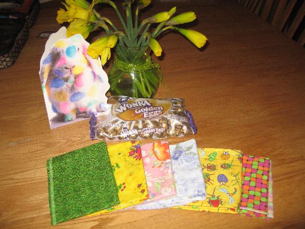 The Easter Bunny took the long trek from the south through the snow to bring me a present and its so cute. Ms Sage I love the fabrics and hubby wants you to know the chocolate was evil but you'll notice hes already opened the chocolate..rofl. Thanks to much they will be fun to use especially the country chickens. :D
