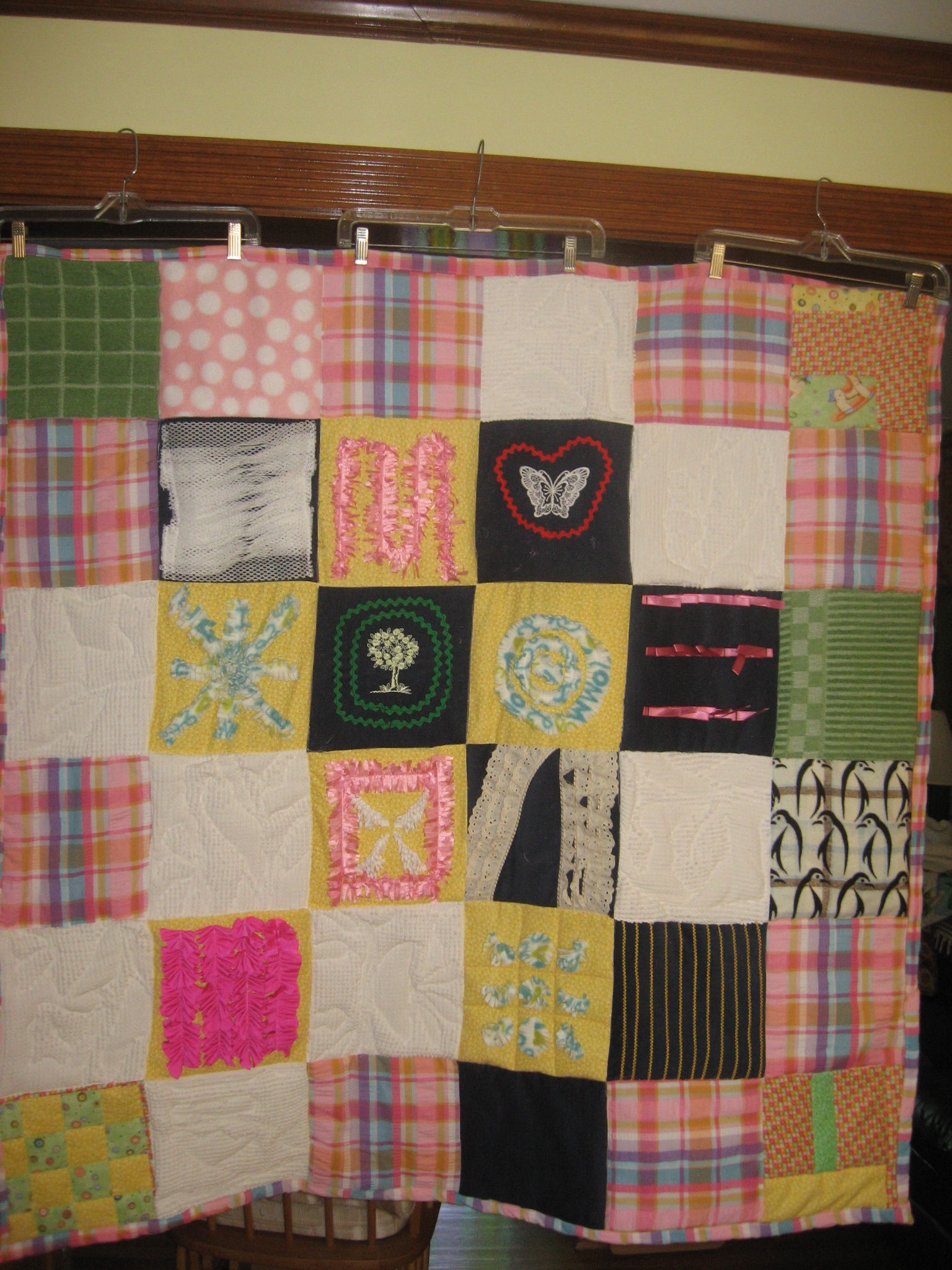 Very sweet quilt. One of my guilds made them for an assisted living home. They were so much fun to make. The more "touchy-feely" things the better!!!