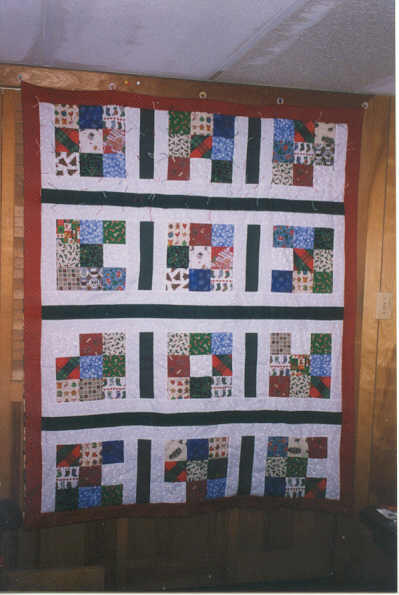 The first was a Christmas nine patch that was claimed by my sister, and the most recent is one that I copied from a picture I saw online. I still have not named this new top. First quilt was only tied, as I was too chicken to try to hand quilt it.