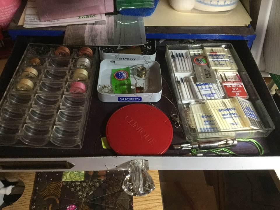 I keep them in the origional box, not the cardboard. A put 2 boxes of my favorites in the notions box for each machine. The rest are in an old Tupperware small storage box. Hand needles are in the box from hand work.